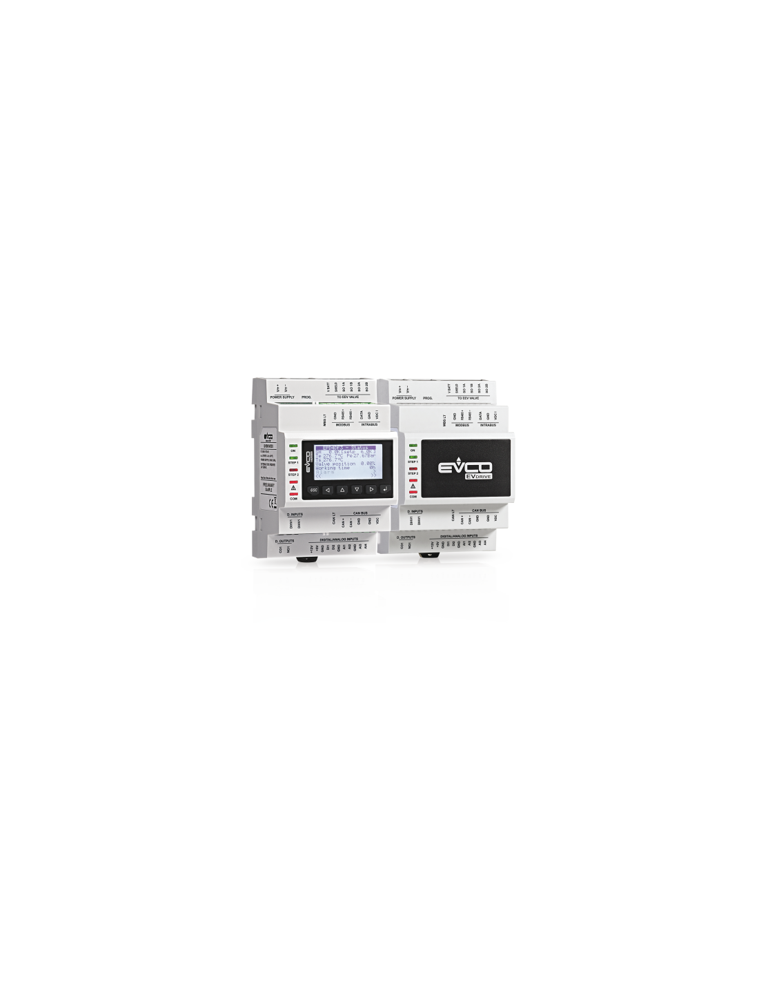- un pilote éventuel pour vannes de détente électroniques de type pas à pas bipolaire pour chaque circuit (EVDRIVE03, disponible avec interface utilisateur intégrée ou dans la version borgne)