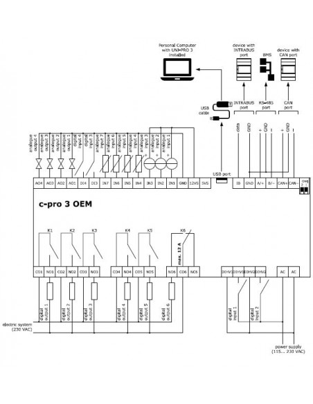 Le protocole INTRABUS permet l'utilisation d'une interface utilisateur à distance LED économique (Vled Intrabus) pour des applications point-à-point. Le protocole CAN permet, quant à lui, d'accroitre le nombre d'E/S de c-pro 3 OEM grâce à l'ajout d'extensions et de s'intégrer à toute la famille de dispositifs de contrôle et afficheurs de la série c-pro 3.