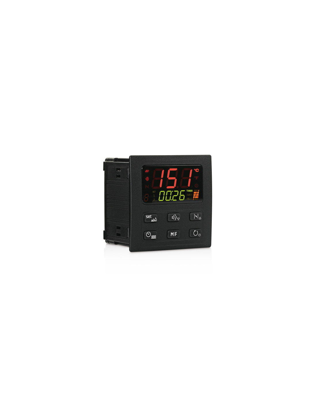 Ils sont disponibles dans la version compacte, au format de 96 x 96 mm ; l'interface utilisateur se compose d'un afficheur à 2 lignes (avec icônes de fonction), de 6 touches et indice de protection IP54 pour faciliter le nettoyage.